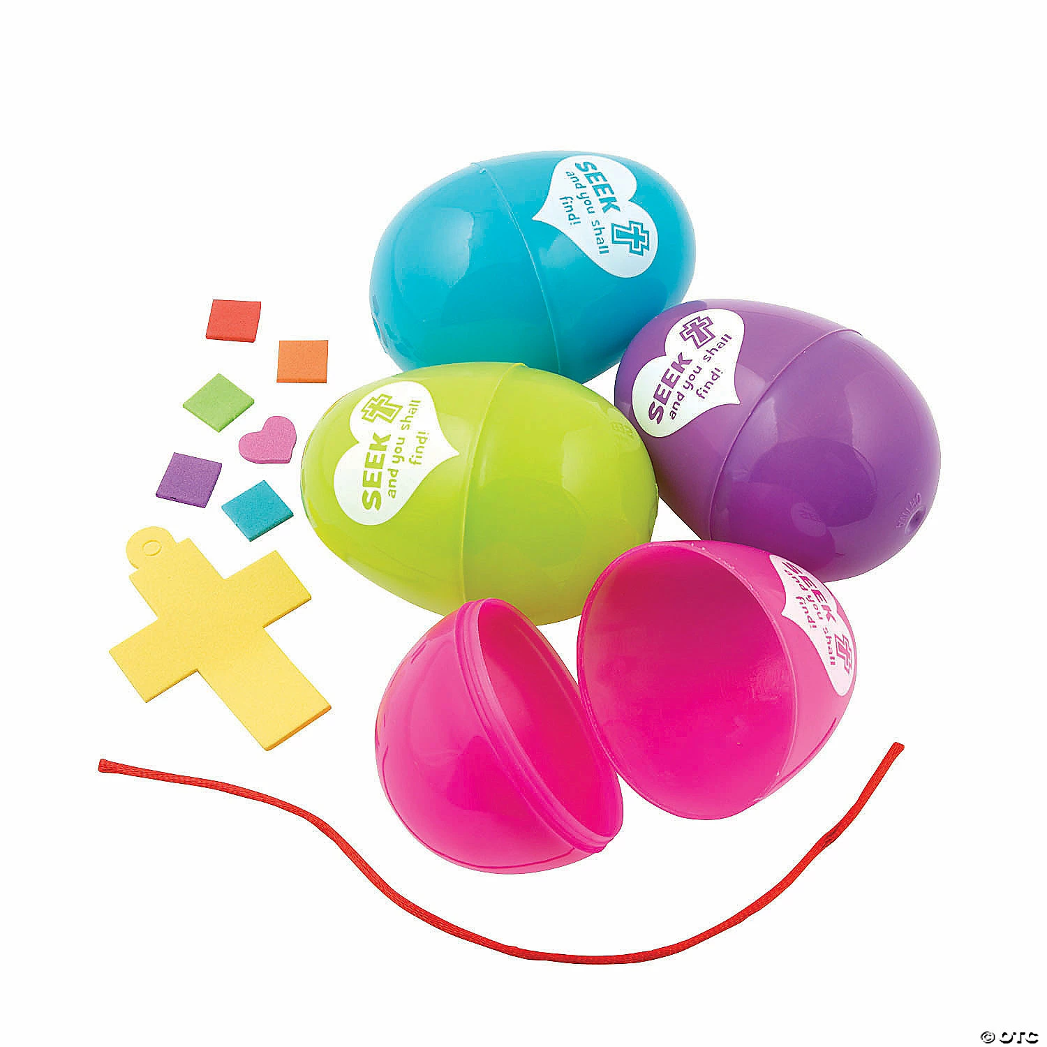 Seek and you shall find! It’s a great religious statement especially perfect for Easter egg hunts. Add these fun filled Easter eggs to your supplies for your church hunt. Little egg hunters will love finding these eggs and completing the simple craft inside. Use these eggs as candy alternatives in Easter baskets, too! Includes 12 eggs and 12 crosses with self-adhesive foam pieces and satin cording. Plastic. 3″ © OTC