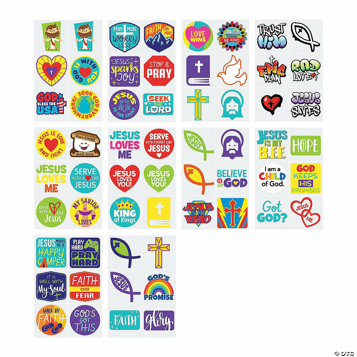 Show you believe with these temporary tattoos! An uplifting addition to giveaways, carnival prizes, Sunday School classroom rewards, VBS supplies and party favors, this huge tattoo assortment features fun and faithful designs, inspirational phrases, crosses and more. Place them in goody bags or set up a temporary tattoo booth at the next celebration! Easy to apply and remove. Safe and non-toxic. Paper. (360 pcs. per unit) 1 1/2″ Assortment may vary. ยฉย OTC