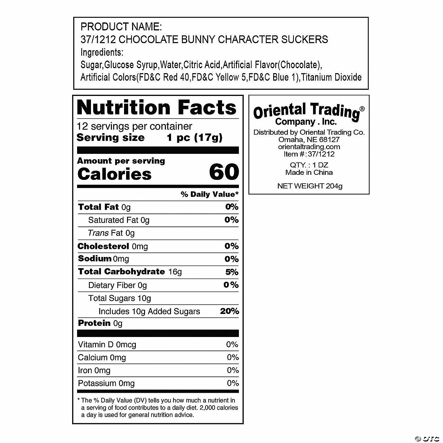 A chocolate-flavored Easter candy for your Easter baskets! These chocolate bunny buddies are shaped like classic chocolate bunnies with candy eyes and bows in blue, yellow, pink and green colors. Each 2 1/4″ chocolate-flavored sucker is on a 4″ plastic stick. Individually wrapped. (1 dozen per unit, total weight, 7 oz.) Fat-free. © OTC• Candy is non-returnable. For more information, visit our “Return Policy” page located on our website.• Ingredient, nutrition, allergen and other product information are provided on our Web and Mobile sites for reference purpose only, without warranty or representation as to accuracy. Manufacturers adjust their labeling regularly and are solely responsible for the accuracy of the information. For general questions concerning these items, please contact our customer service at 800-228-0475.