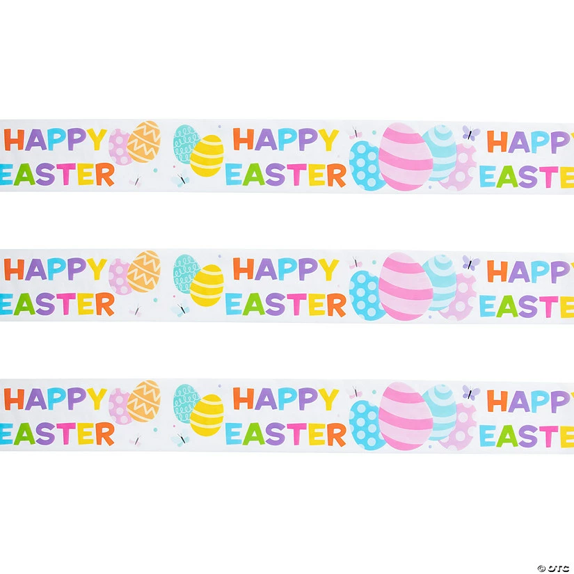 Block off a space in a colorful and cheerful way with this cute caution tape roll. Featuring a repeating “Happy Easter” message along with colorful Easter images, this caution tape is the perfect choice to section off spaces for an outdoor Easter egg hunt while keeping with the Easter decoration theme. Plastic. 4 1/2″ x 244″