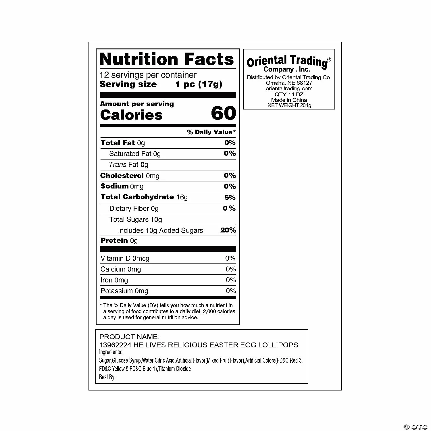 Here’s something sweet to celebrate Easter! These colorful lollipops feature cross imagery and are shaped like Easter eggs. The wrapper features the Easter message “He lives”, making these lollipops perfect as religious Easter handouts. Distribute these candies to Sunday School kids or leave a jar of them out in a church’s entrance for everyone to enjoy. Fruit punch flavor. Individually wrapped. 2″ pops on 4″ plastic stick. Total wt., 7 oz. © OTC• Candy is non-returnable. For more information, visit our “Return Policy” page located on our website.• Ingredient, nutrition, allergen and other product information are provided on our Web and Mobile sites for reference purpose only, without warranty or representation as to accuracy. Manufacturers adjust their labeling regularly and are solely responsible for the accuracy of the information. For general questions concerning these items, please contact our customer service at 800-228-0475.