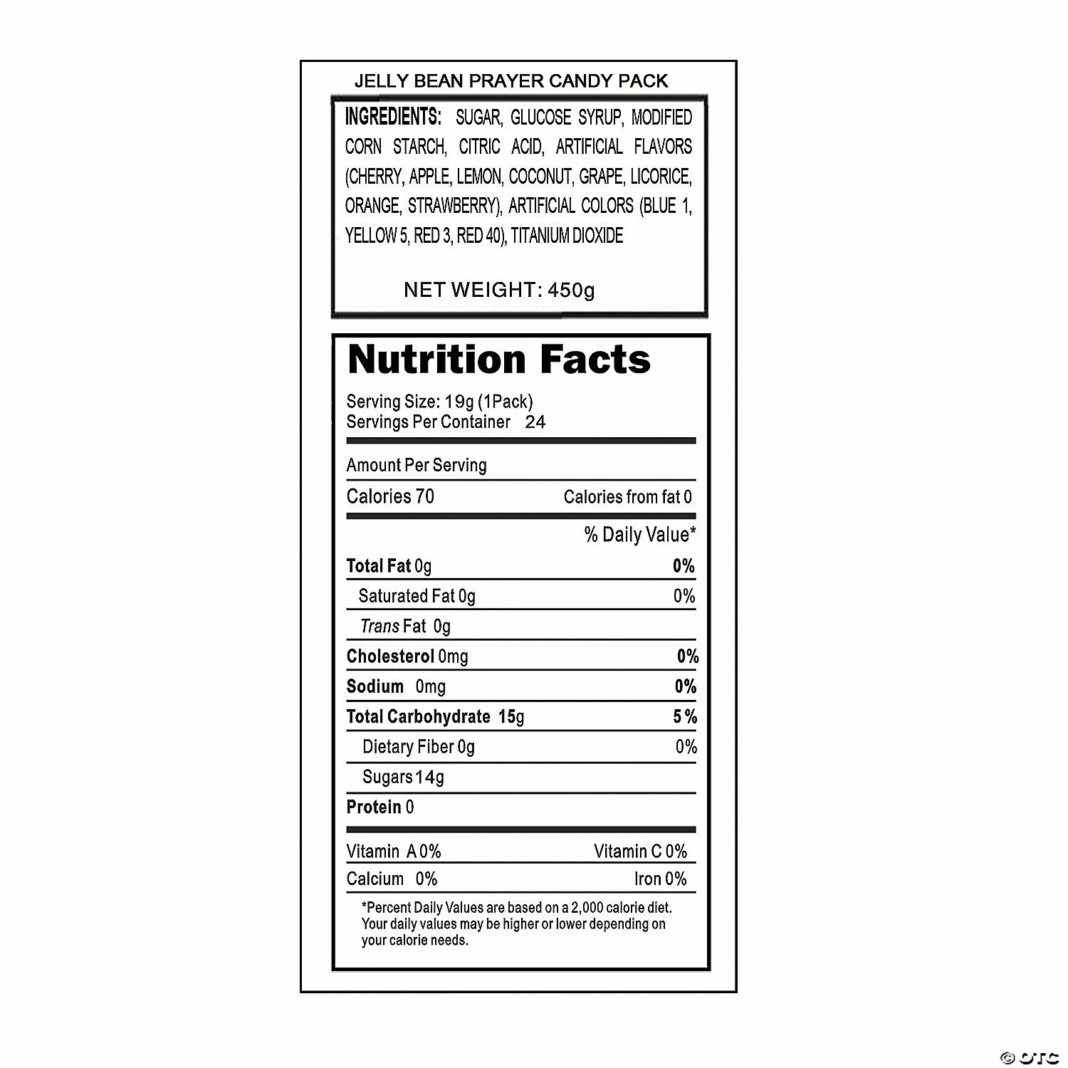 Use these fun-filled Jelly Bean Prayer Candy Packs to teach your students the importance of prayer. Whether you’re searching for religious party favors, unique VBS giveaways or new Sunday School activities, you’ll love the ability to turn a tasty treat into a meaningful lesson! Assorted fruit flavors and colors. Each packet is not guaranteed to contain all 8 flavors/colors. (Approx. 10 pcs. per pack, 17 packs per unit) Fat-free. Packaging may vary from picture shown. © OTC• Candy is non-returnable. For more information, visit our “Return Policy” page located on our website.• Ingredient, nutrition, allergen and other product information are provided on our Web and Mobile sites for reference purpose only, without warranty or representation as to accuracy. Manufacturers adjust their labeling regularly and are solely responsible for the accuracy of the information. For general questions concerning these items, please contact our customer service at 800-228-0475.