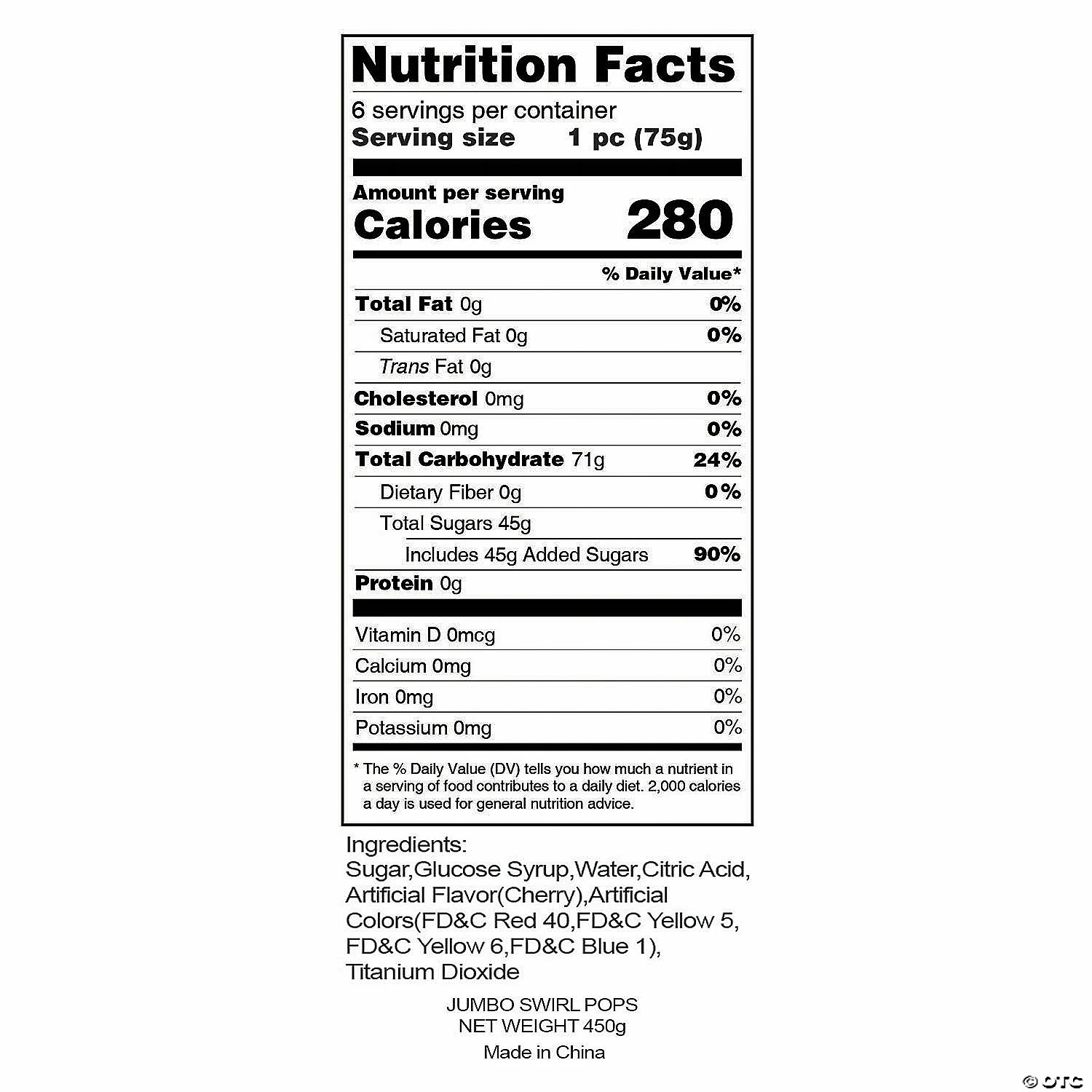 • What’s Included: You get 6 jumbo swirl lollipops on plastic sticks. They’re individually wrapped and have big fruit flavor. • Non-Returnable: Candy is non-returnable. For more information, visit the Return Policy page located on our website.• Important Country of Origin Information: For certain items sold by OTC on our Web or Mobile sites, country of origin information can change and what is displayed may not be accurate or consistent with manufacturer information. For up to date country of origin information, it is recommended that you rely on product packaging or other manufacturer information.• Product Information: These jumbo, swirled lollipops are fat-free, dairy-free, gluten-free and nut-free. Details about ingredients, nutrition, allergens and other product information are provided on our Web and Mobile sites for reference purpose only, without warranty or representation as to accuracy. Manufacturers adjust their labeling regularly and are solely responsible for the accuracy of the information. For general questions concerning these items, please contact our customer service at 800-228-0475.Product Description: Jumbo-sized fun on a stick! These oversized jumbo swirl lollipops are big on fun and fruit flavor. They’re perfect as carnival prizes, candy buffet displays and part favors. They’re sure to draw everyone’s eye, especially when in the hands of a little kid. Style in glass jars as sweet decorations for your candy buffet wedding reception, carnival birthday party or circus-themed corporate event. The set includes six individually wrapped jumbo lollipops on plastic sticks. Specs:Size: 4″ lollipop, 7″ stickQuantity: 1 lb. total, 6 lollipopsDietary needs: Fat-free, dairy-free, gluten-free and nut-freeBrand: © OTC – Oriental Trading Company