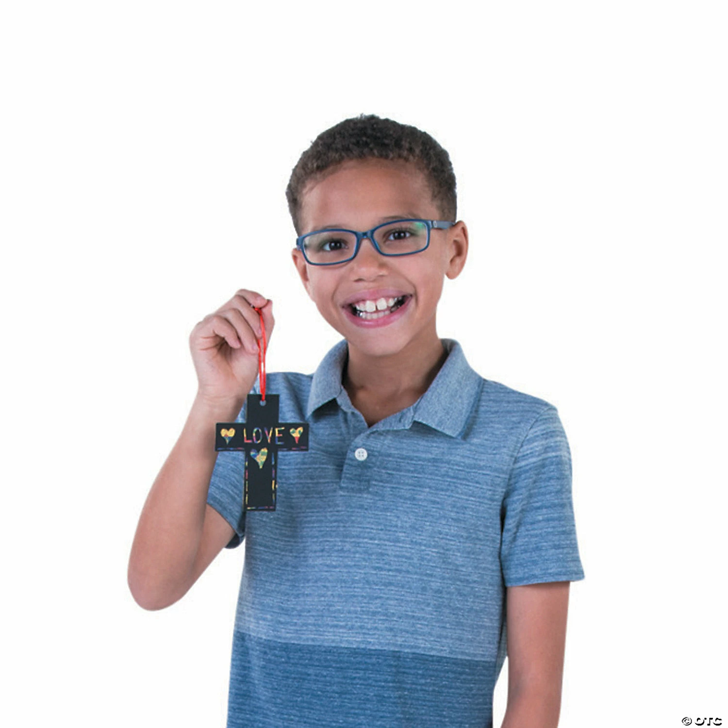 Scratch your own designs on these cross-shaped ornaments. Ideal for Christmas or Easter, this is an easy craft for kids of all ages. Simply use the included scratching tool to remove the black surface and reveal the colorful pattern underneath. See your own designs come to life through these beautiful cross ornaments. Craft projects are an easy rainy-day activity for church groups, Sunday School and day cares. (2 dozen ornaments, 1 dozen scratching tools and 2 dozen satin ribbons per unit) 4 1/4″ © OTC