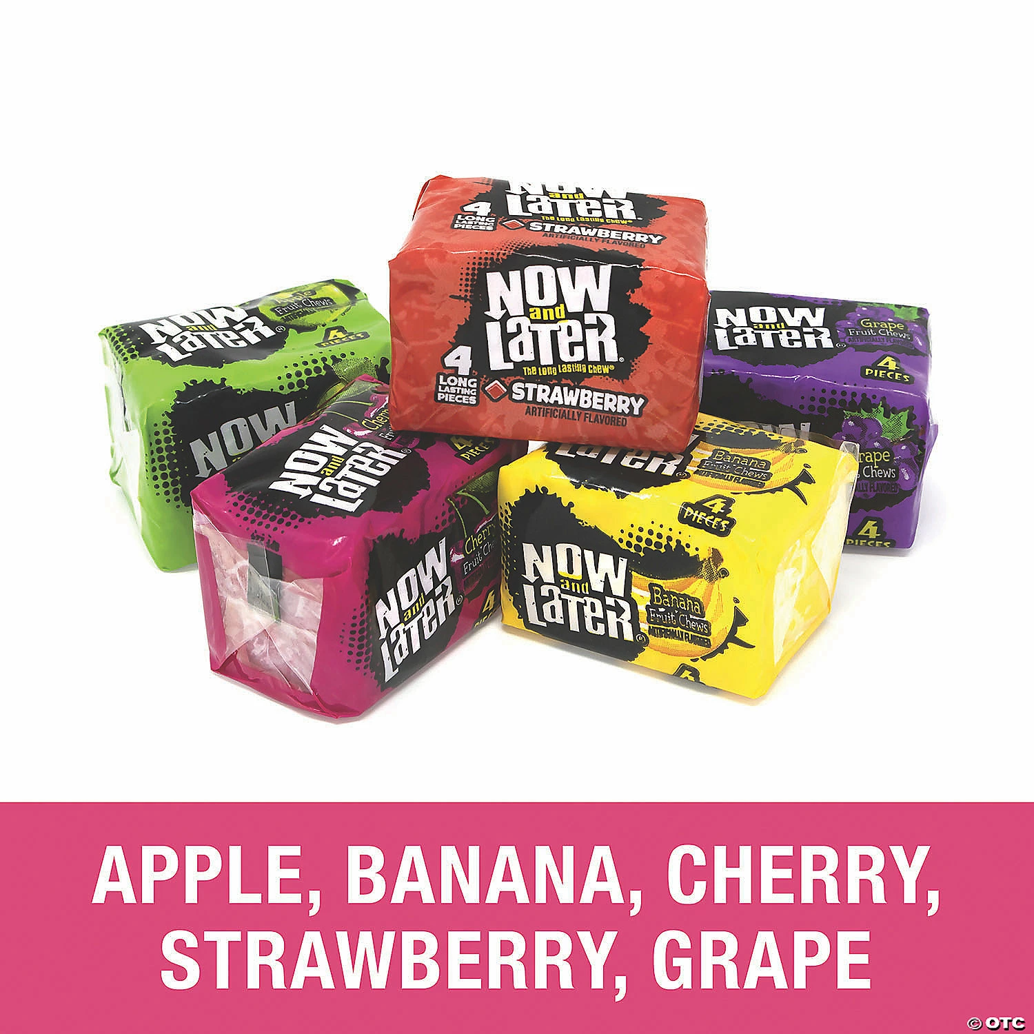 Sink your teeth into these soft, sometimes hard, delicious fruit chews! Now and Later Mini Bars come in Cherry, Banana, Strawberry, Apple, and Grape flavors. With approximately 100 mini bars per tub, you can fill the pinata or candy buffet at your next party or celebration. These long lasting chews make for a great afternoon pick-me-up. Enjoy the assorted flavored Now and Later Mini Bars in this 60-Ounce tub!Candy is non-returnable. For more information, visit our “Return Policy” page located on our website.Special Shipping Information: This item ships separately from other items in your order. This item cannot ship to a P.O. Box. This item may be subject to additional processing days. ITEM IS NOT ELIGIBLE FOR EXPEDITED SHIPPING