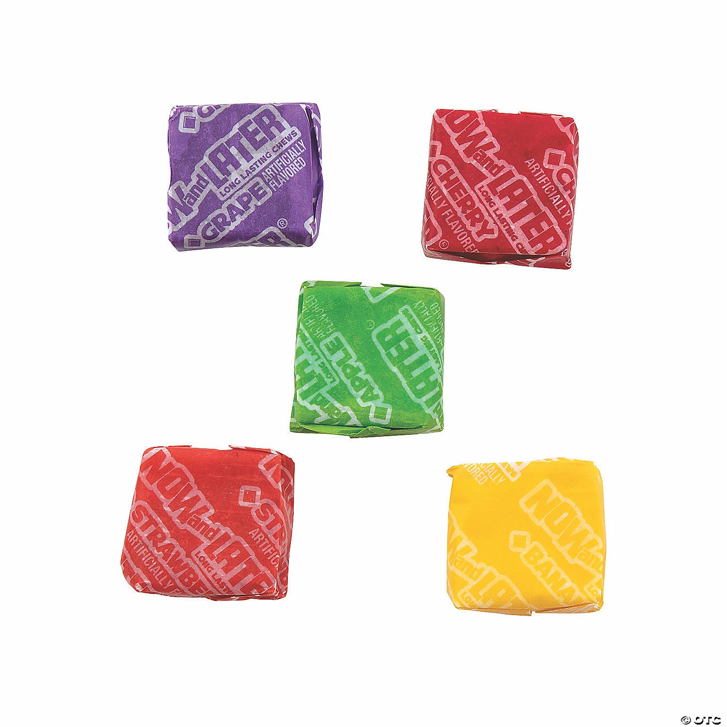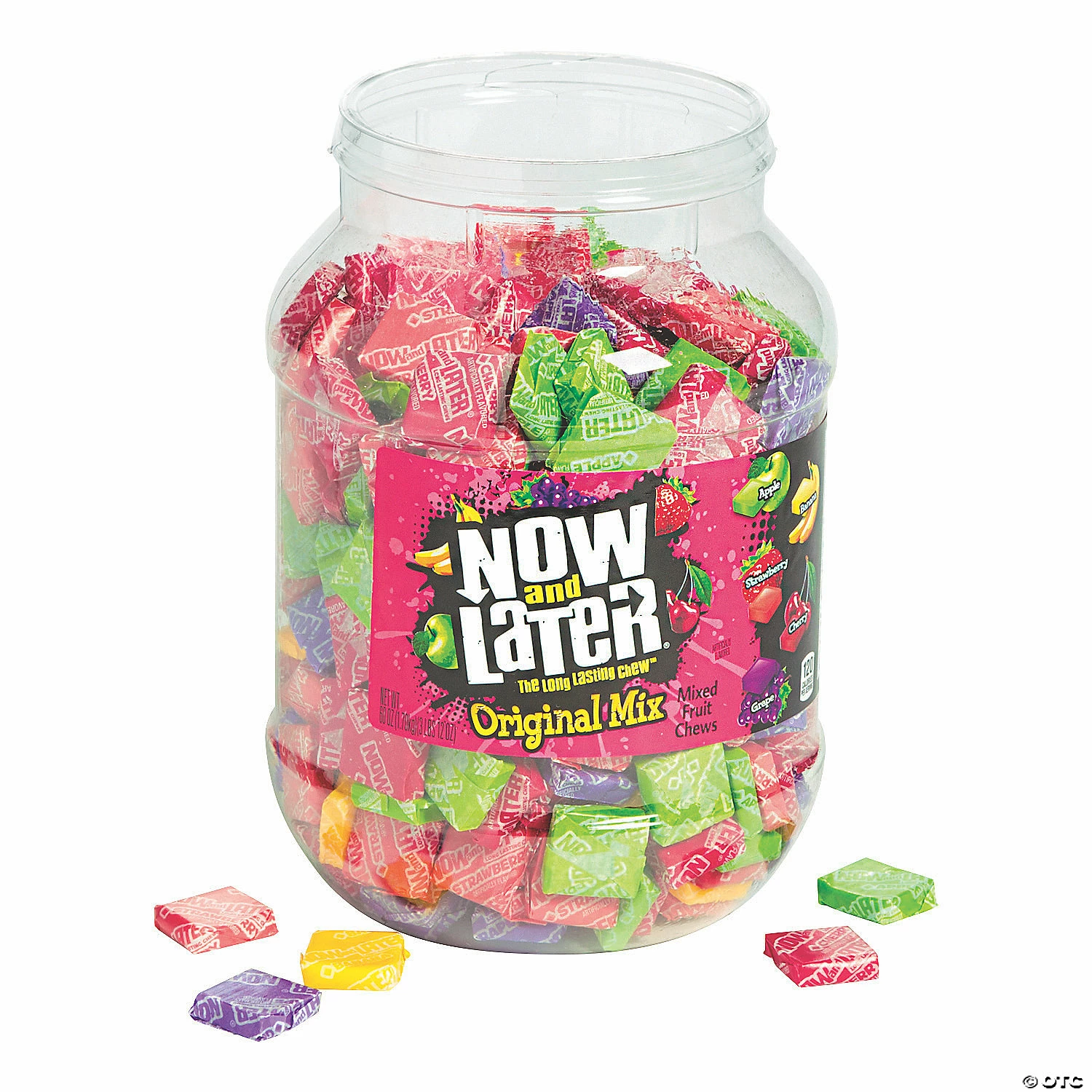 • What’s Included: You get 400 individually wrapped Now & Later® chews in a reusable plastic jar. The original mix includes apple, grape, cherry, banana and strawberry flavored candy chews.• Non-Returnable: Candy is non-returnable. For more information, visit the Return Policy page located on our website.• Important Country of Origin Information: Made in the U.S.A. For certain items sold by OTC on our Web or Mobile sites, country of origin information can change and what is displayed may not be accurate or consistent with manufacturer information. For up to date country of origin information, it is recommended that you rely on product packaging or other manufacturer information.• Product Information: Now & Later® fruit chews are gluten-free. Details about ingredients, nutrition, allergens and other product information are provided on our Web and Mobile sites for reference purpose only, without warranty or representation as to accuracy. Manufacturers adjust their labeling regularly and are solely responsible for the accuracy of the information. For general questions concerning these items, please contact our customer service at 800-228-0475.Product Description: Enjoy them now and later! The Now & Later® candy jar comes filled with 400 tasty and tart candy chews. A Halloween favorite for years, everyone will be happy if you hand out these long lasting chews to trick-or-treaters. They’re equally as popular as Easter candy treats, birthday party favors, and as event giveaways and rewards. Stash the jar in your desk drawer so you can always keep your office candy dish filled.Specs:Size: 3 lbs. 12 oz.Quantity: 400Dietary needs: Gluten-free
